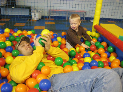 my best little pal loves 3 things more than anything else: 1. rough housing 2. thomas the train and 3. his dvd player. we took him to the jump and climb a few weeks ago and he got to rough house with his dad in the ball pits, which he just loved.